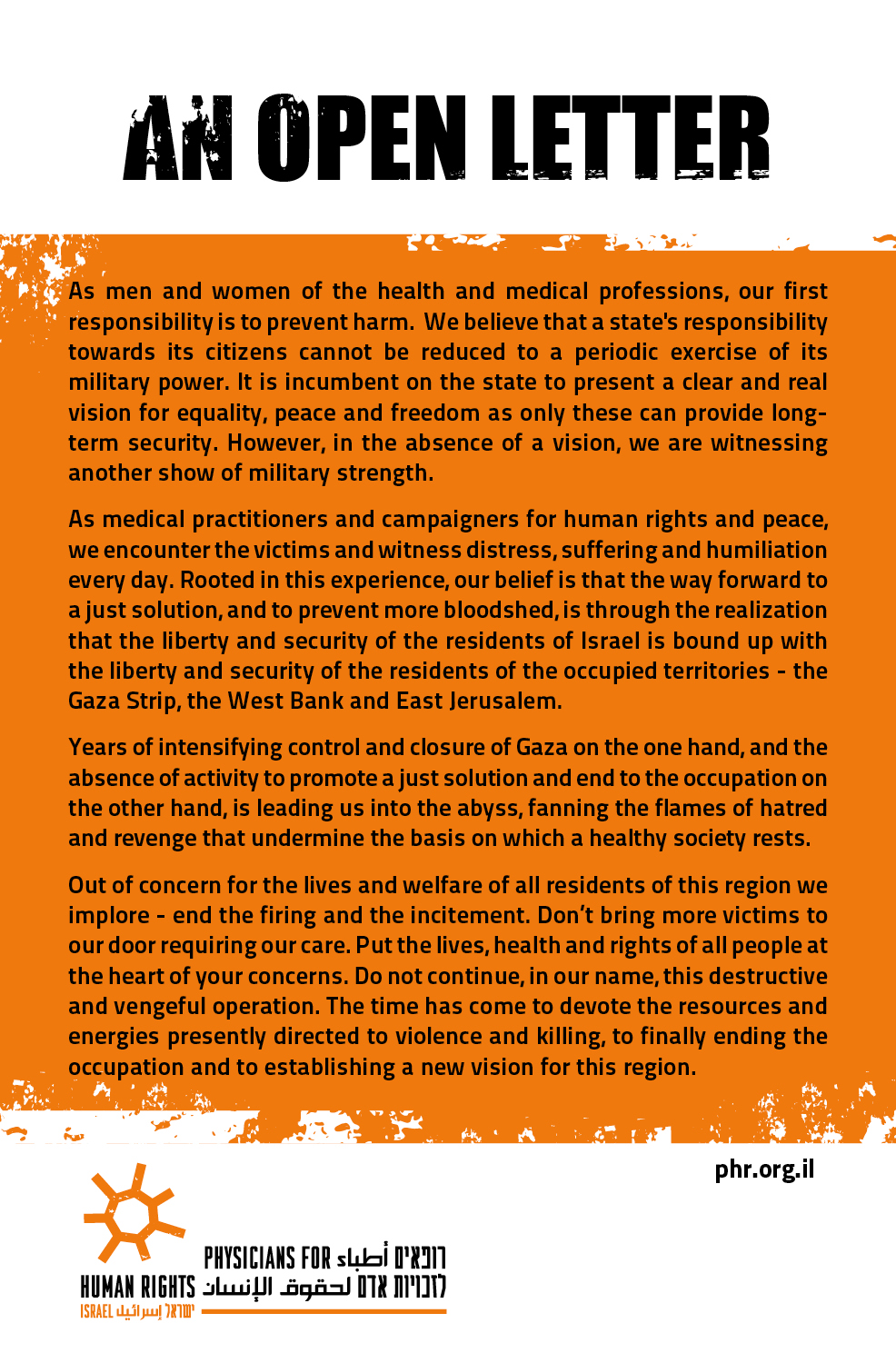 PHR-IL calls for the State of Israel to stop the military offensive and to avoid at all costs any direct attack on or near the facilities and medical infrastructure and to avoid any attacks on medical and rescue teams and patients: “Out of concern for the lives and welfare of all residents of the area we make a heartfelt and resounding call – stop the fire and stop the incitement. Do not bring before us more victims that require treatment. Put the lives, health and rights of all human beings at the head of your concerns. Do not continue on our behalf with this operation causing further destruction and revenge. It is time to devote the resources and energies that are being directed to war and killing to finally end the occupation and to establish a different vision”.