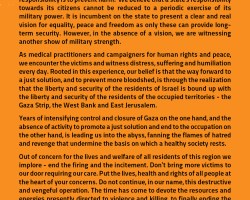 PHR-IL calls for the State of Israel to stop the military offensive and to avoid at all costs any direct attack on or near the facilities and medical infrastructure and to avoid any attacks on medical and rescue teams and patients: “Out of concern for the lives and welfare of all residents of the area we make a heartfelt and resounding call – stop the fire and stop the incitement. Do not bring before us more victims that require treatment. Put the lives, health and rights of all human beings at the head of your concerns. Do not continue on our behalf with this operation causing further destruction and revenge. It is time to devote the resources and energies that are being directed to war and killing to finally end the occupation and to establish a different vision.
